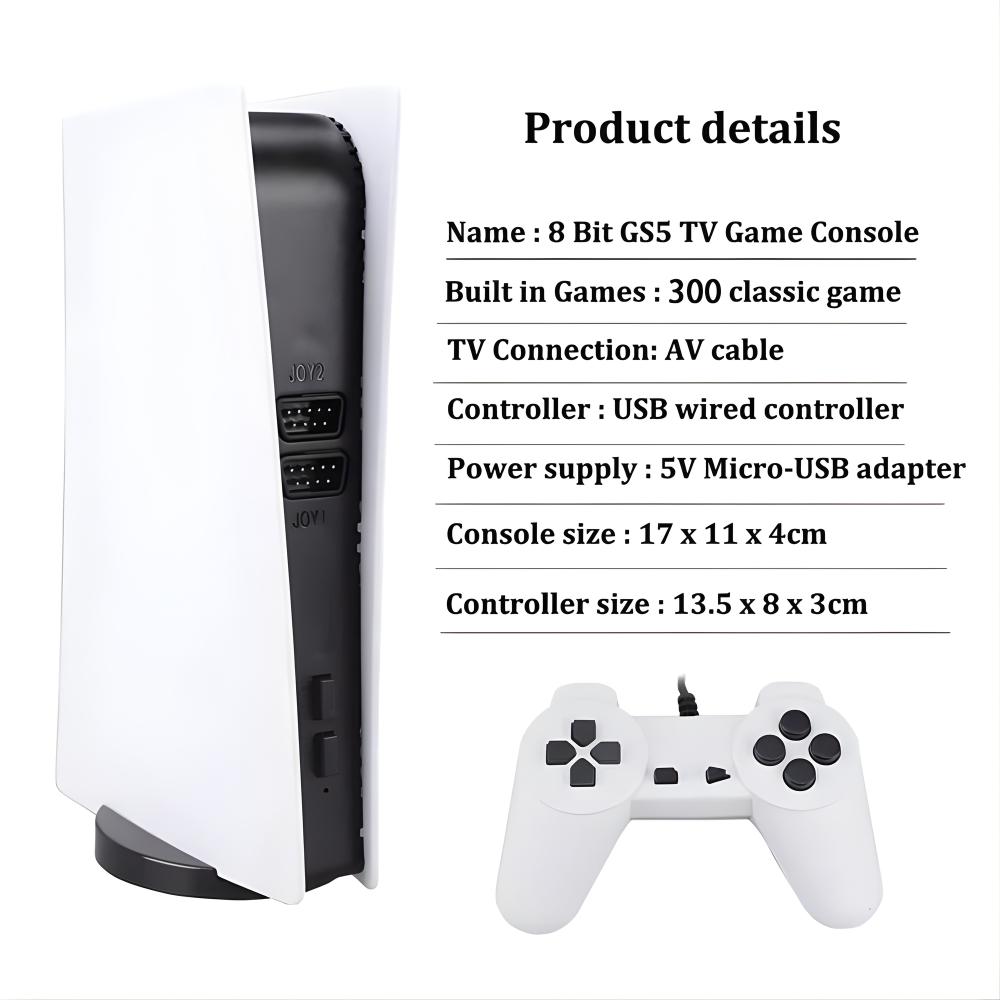 Consola jocuri video TV Mini SYNO GS5 – retro 8-bit cu 200 jocuri incorporate clasice, perfecta pentru nostalgie si distractie pe ecran mare! Aspect elegant alb, dimensiuni compacte (170 x 70 x 40 mm), se conecteaza usor la televizor prin cablu AV. Ofera doua controllere wired cu fir (conexiune stabila si rapida) pentru jocuri cu 2 jucatori simultan.