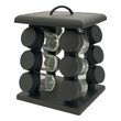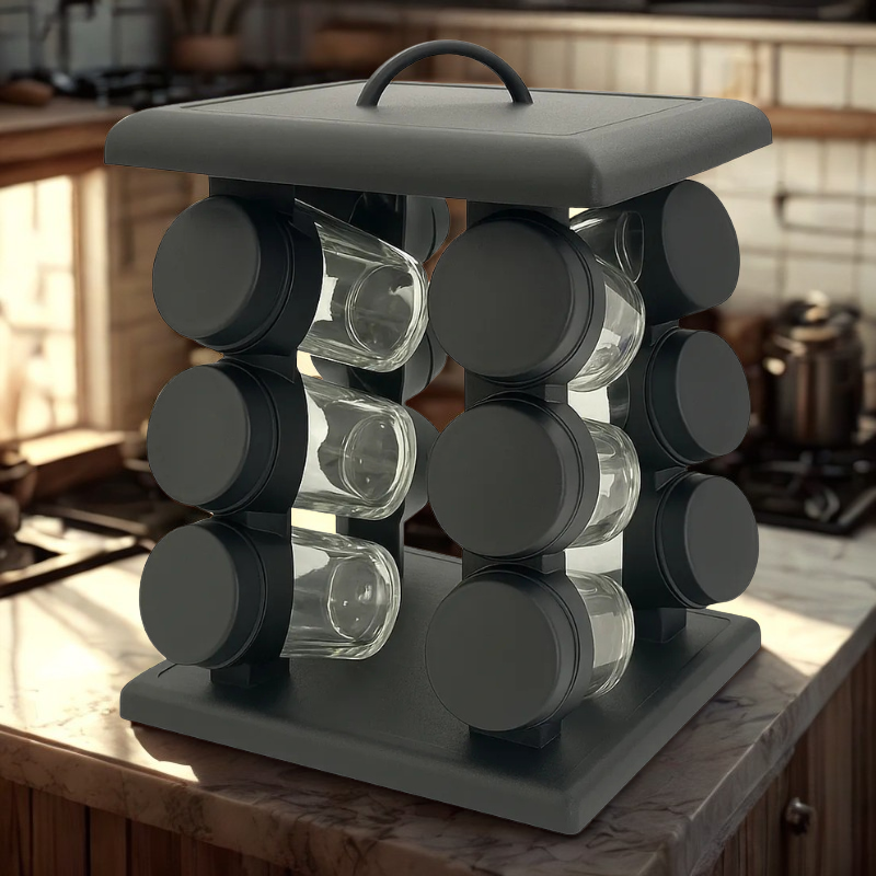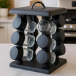 Raft condimente rotativ cu 12 borcane sticla, suport negru modern